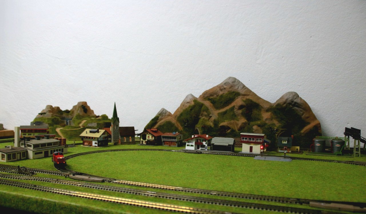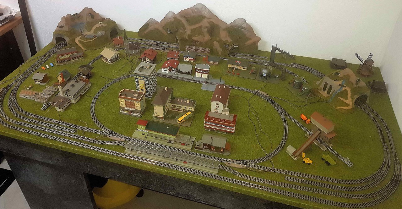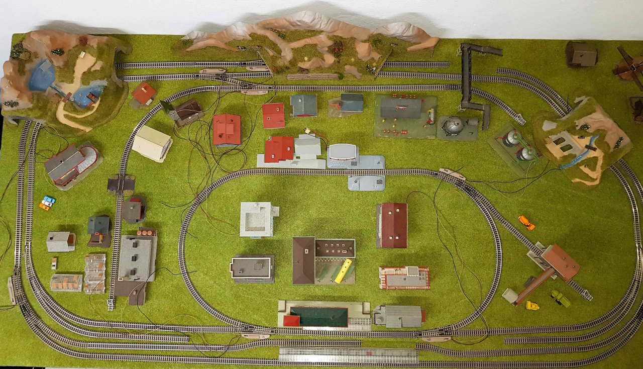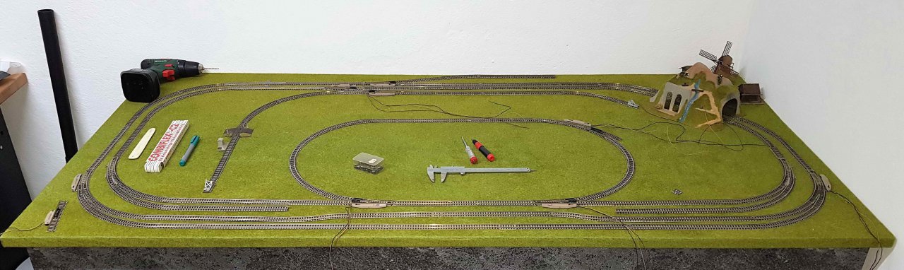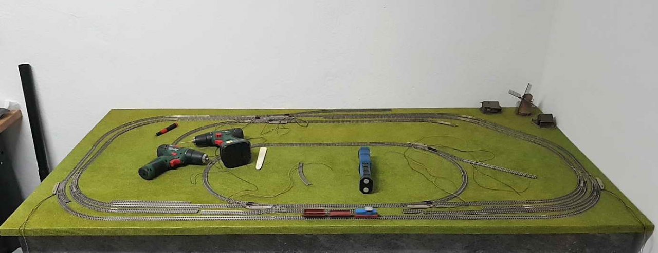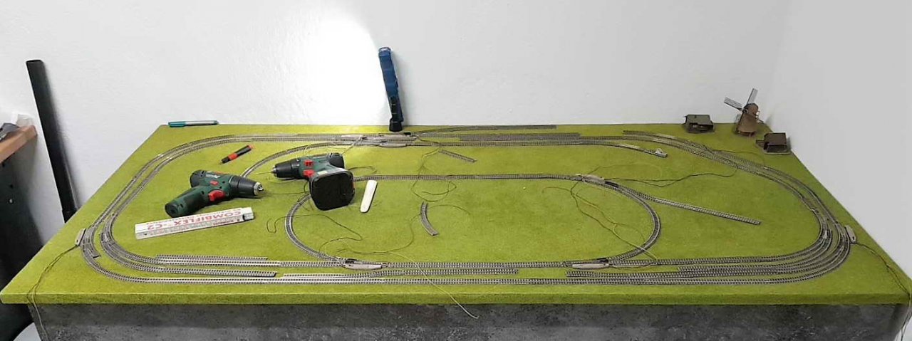 Provisorischer Aufbau um von den Gleisen bis zu den Gebäuden alles so auszurichten, dass es gut auf die Grundplatte passt.