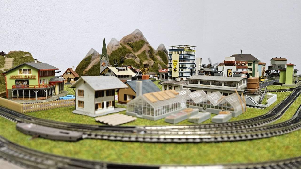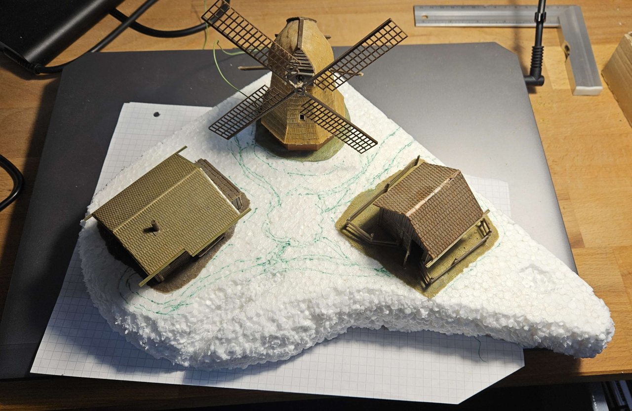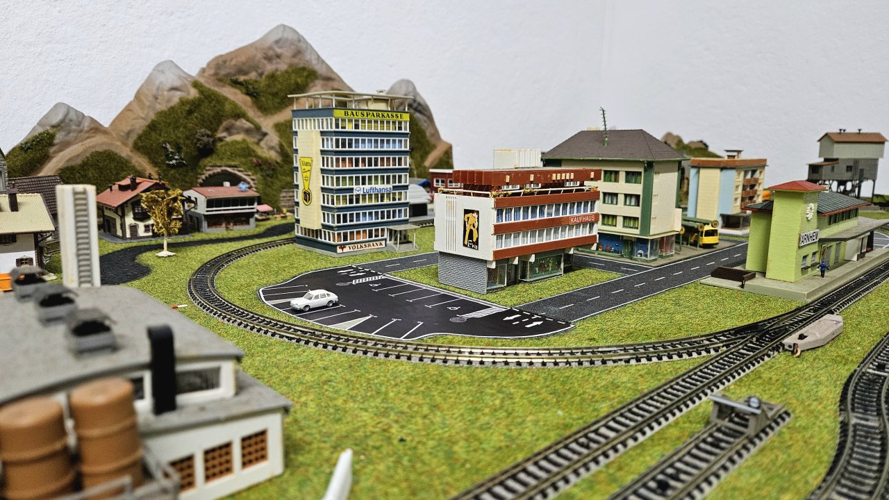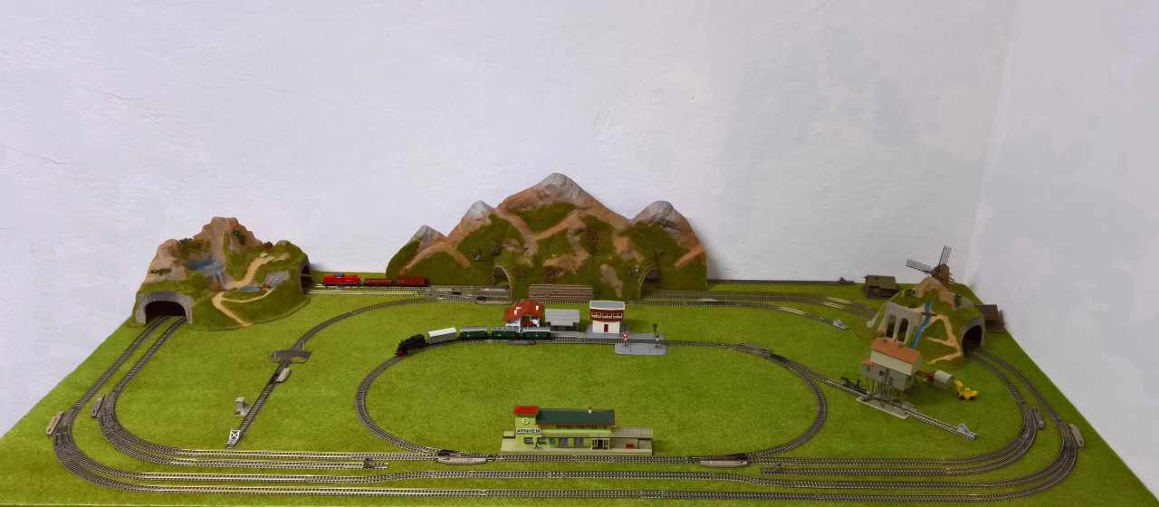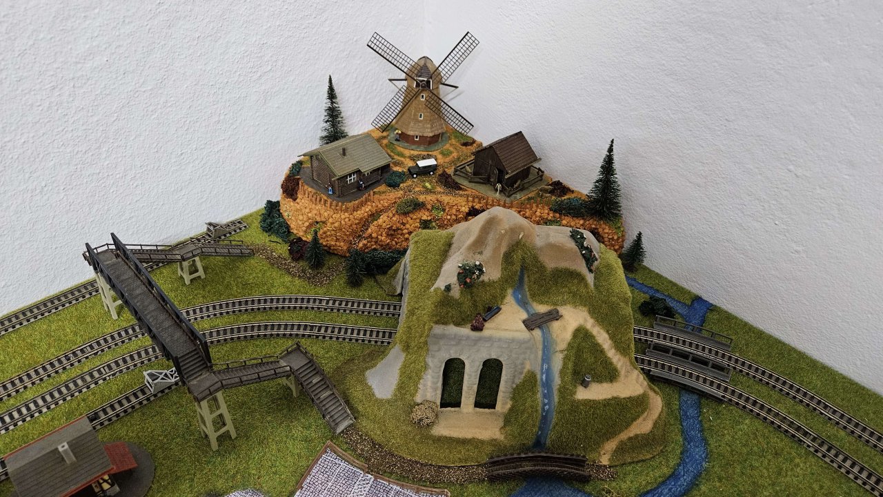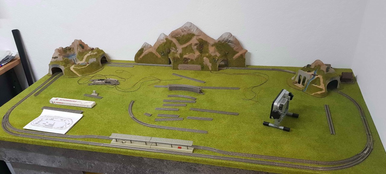 Provisorischer Aufbau um von den Gleisen bis zu den Gebäuden alles so auszurichten, dass es gut auf die Grundplatte passt.