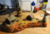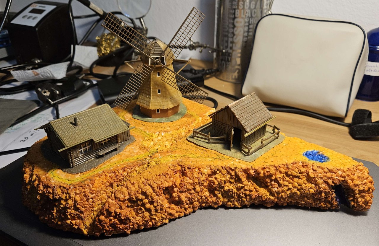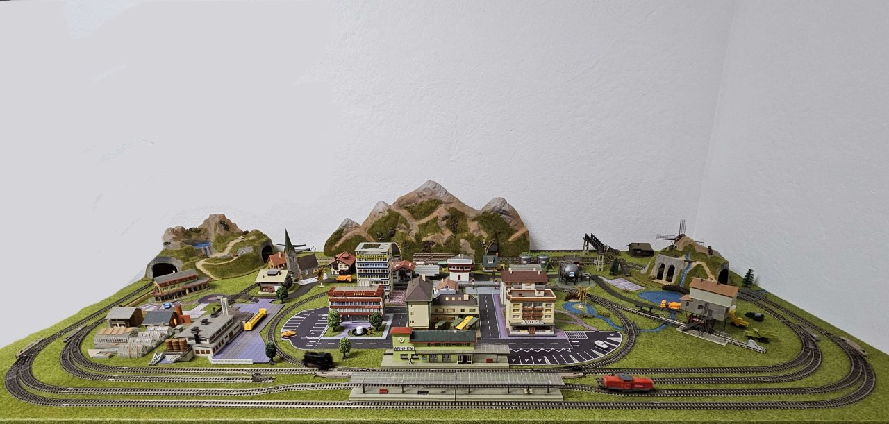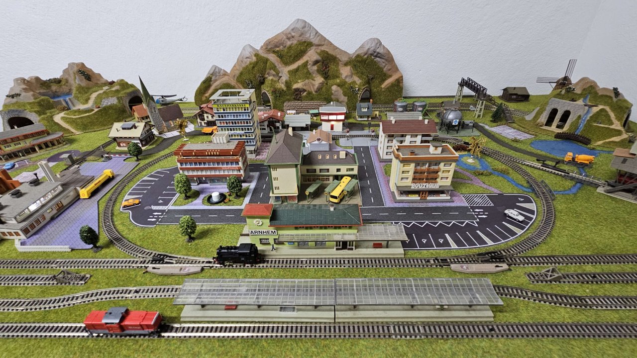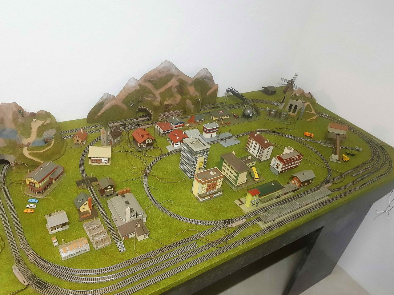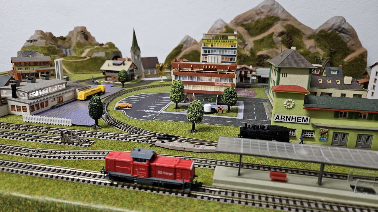 Provisorischer Aufbau um von den Gleisen bis zu den Gebäuden alles so auszurichten, dass es gut auf die Grundplatte passt.